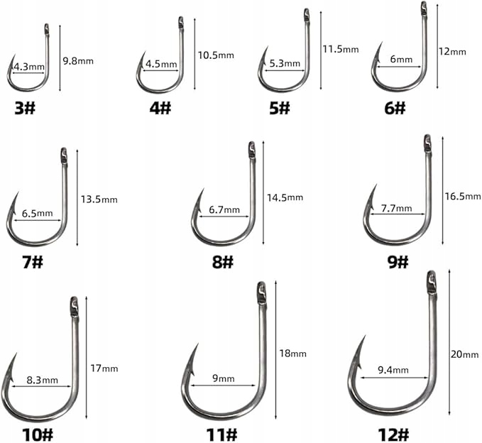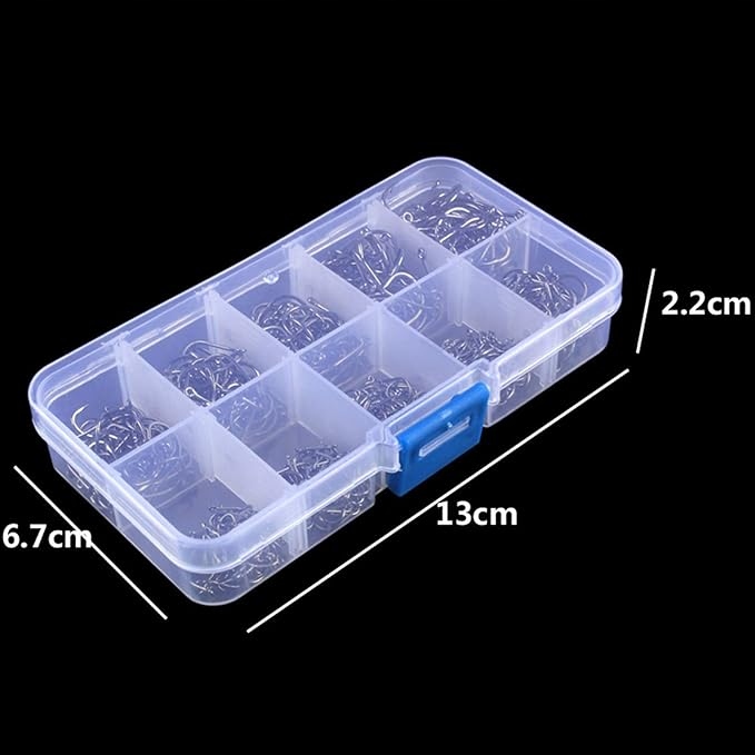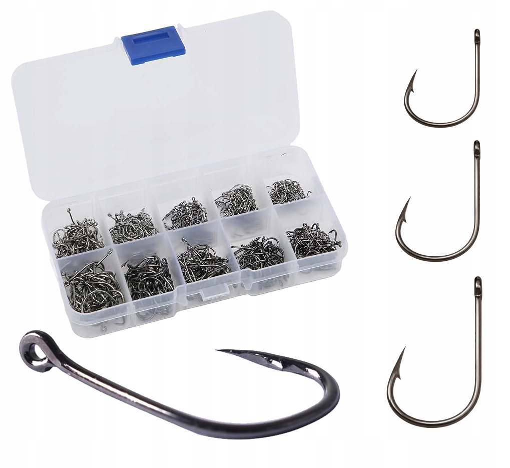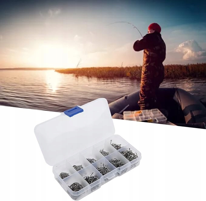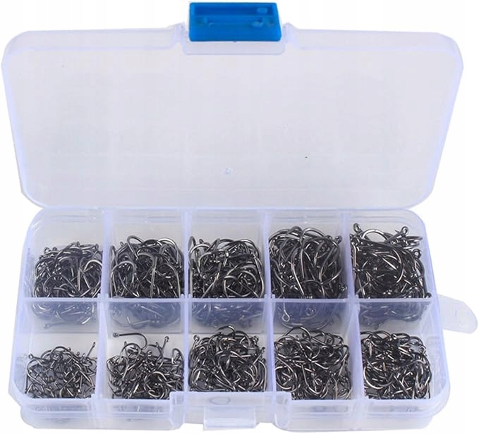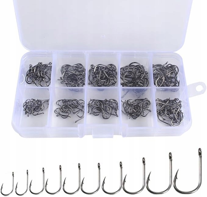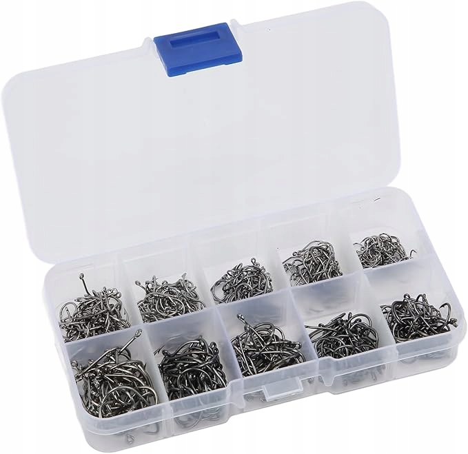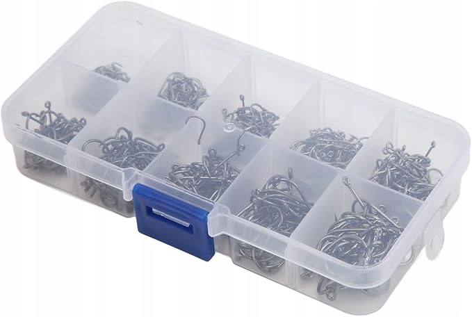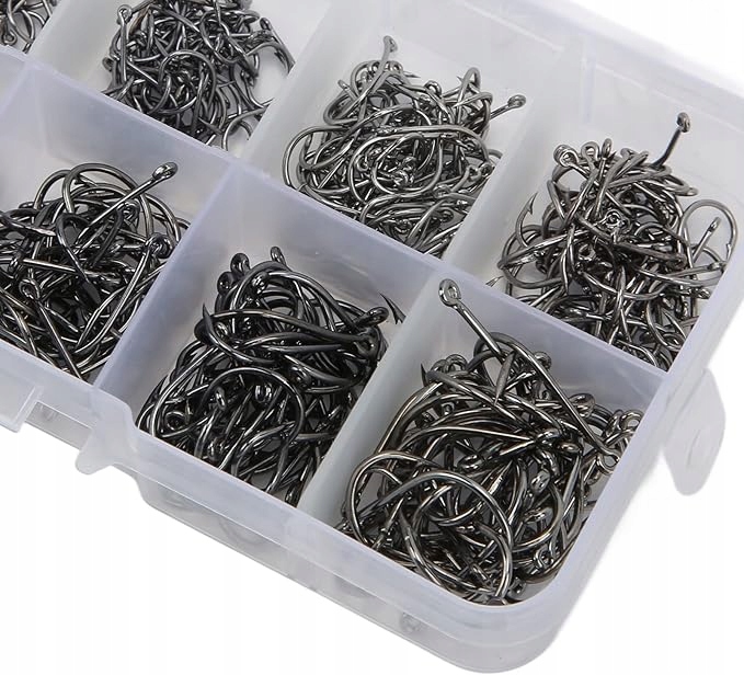 Całość zapakowana jest w praktyczne, przezroczyste pudełko z przegródkami, które ułatwia organizację i szybki dostęp do odpowiedniego rozmiaru haczyka.