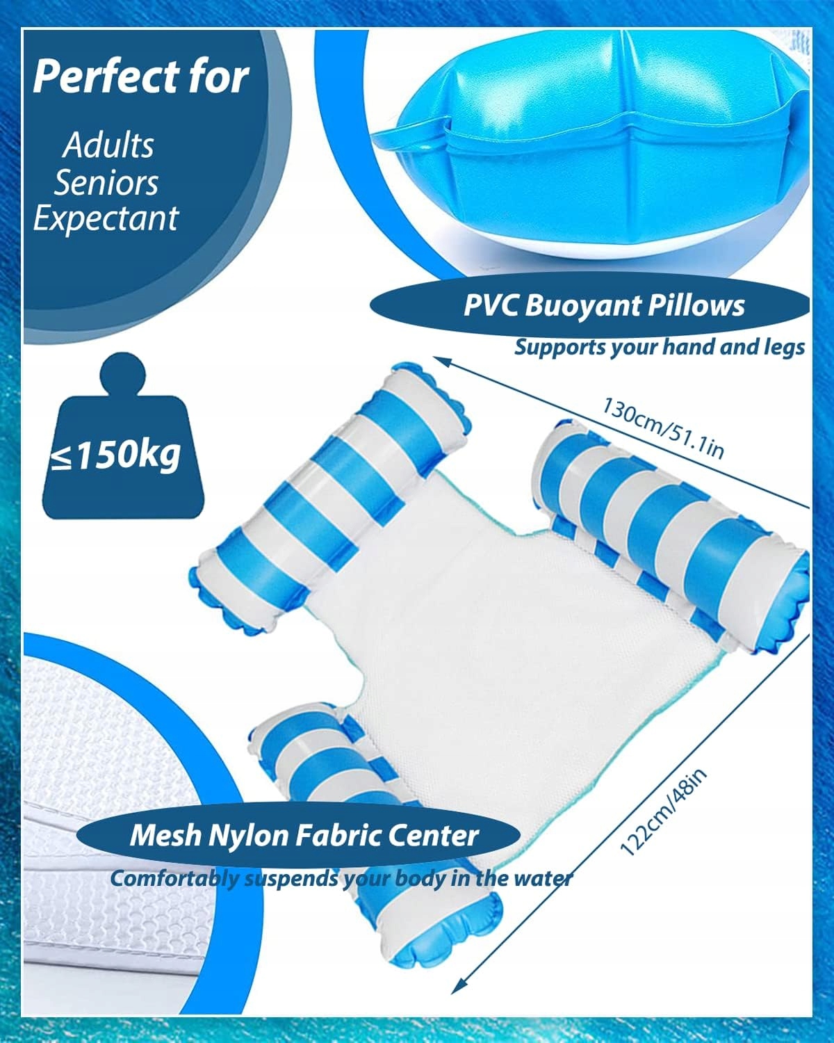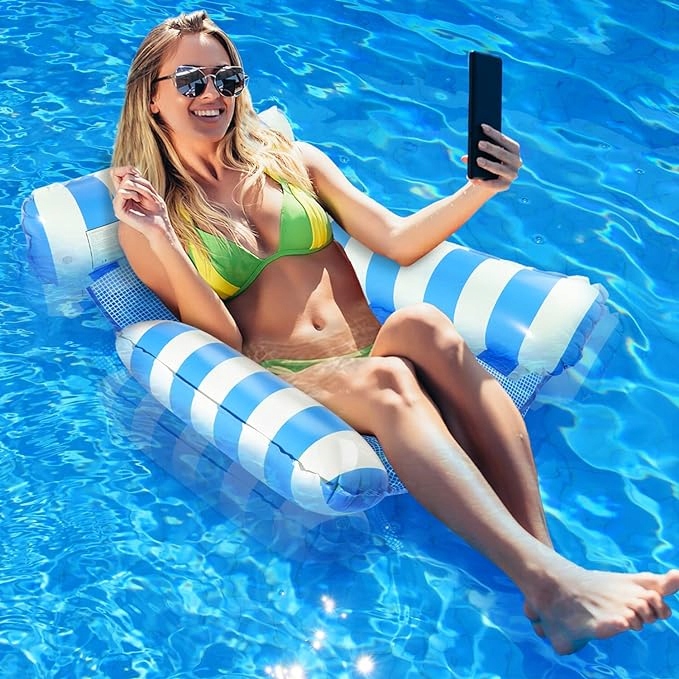 Nadmuchiwany hamak wodny z 3 poduszkami, miękki i wygodny. Ręce można oprzeć po obu stronach na poduszce powietrznej.