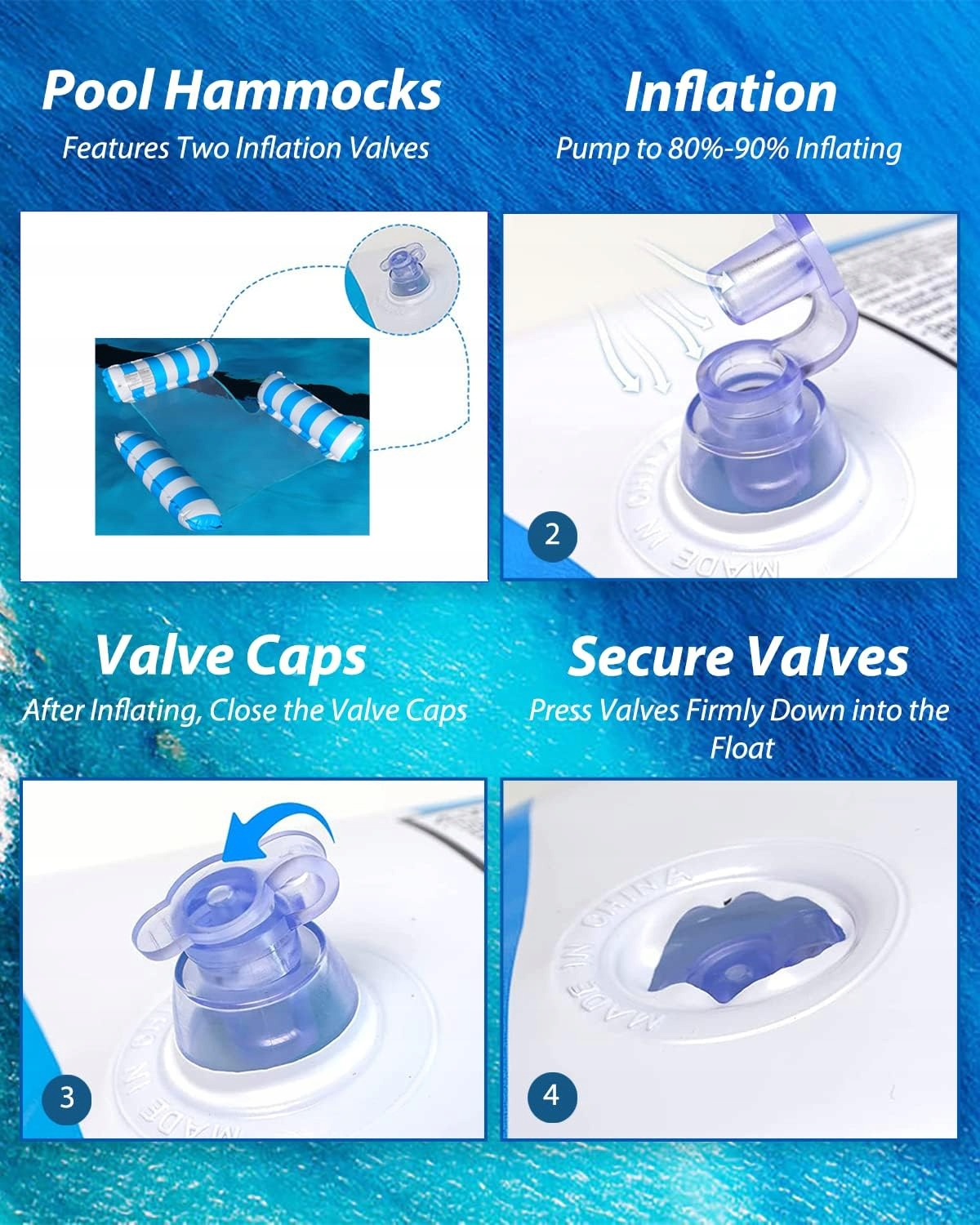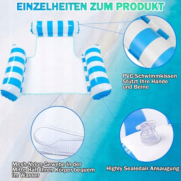 Nadmuchiwany hamak wodny z 3 poduszkami, miękki i wygodny. Ręce można oprzeć po obu stronach na poduszce powietrznej.