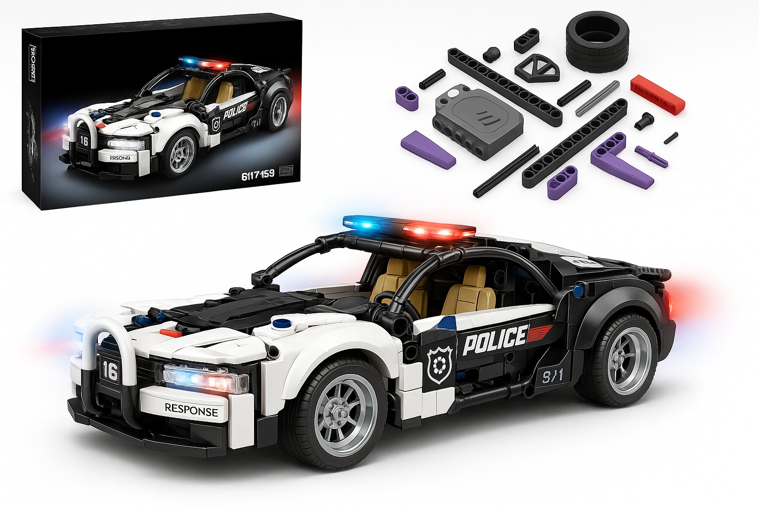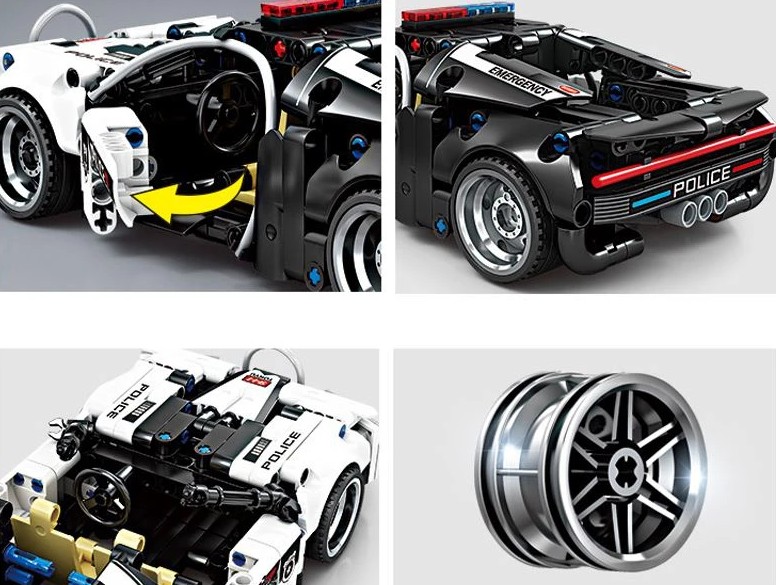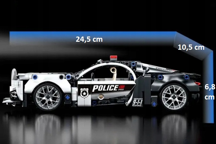 - Realistyczny model – szczegółowy sportowy samochód policyjny inspirowany Bugatti, z otwieranymi drzwiami i ruchomym układem kierowniczym.