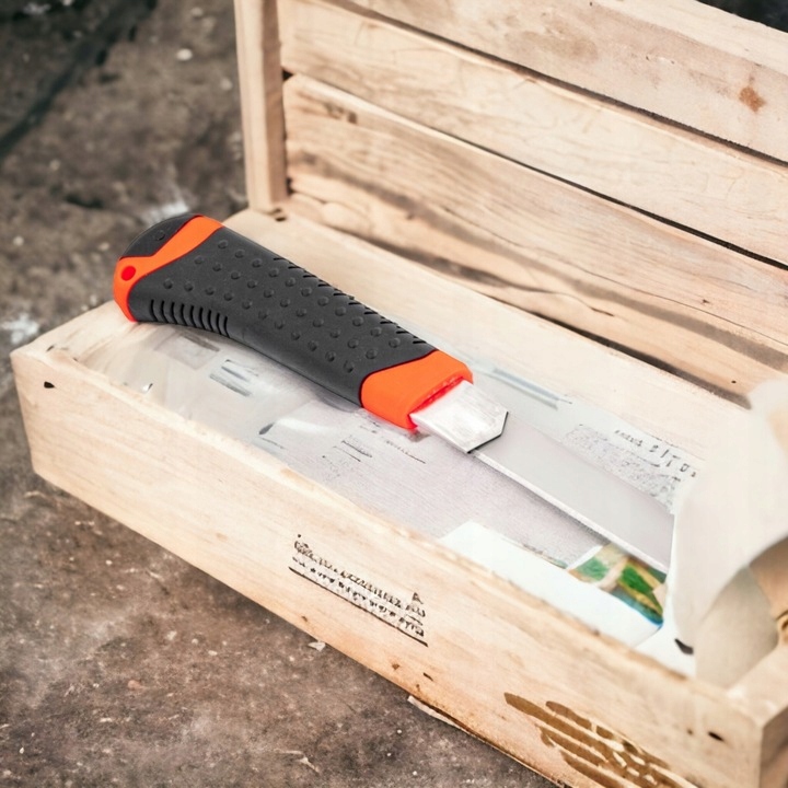 Nożyk wykonany z twardego plastiku. Uchwyty zostały powleczone gumą dla pewniejszego chwytu. W zestawie ostrze łamane 18 mm.