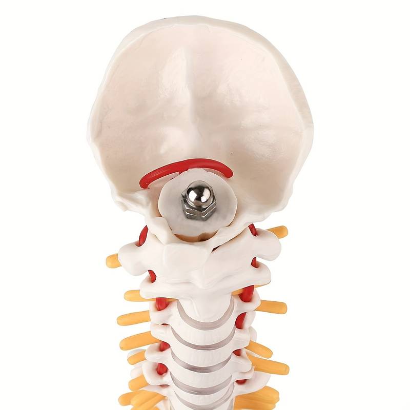 Niezwykła dbałość o szczegóły oraz wysoka jakość wykonania sprawiają, że model przedstawia wszystkie cechy charakterystyczne dla kręgosłupa oraz miednicy dorosłego mężczyzny. Każdy kręg składa się z trzonu, wyrostka kolczystego, wyrostków poprzecznych, nasady łuku oraz kanału kręgowego. Na modelu z łatwością zlokalizujesz część podstawną kości potylicznej, odcinek szyjny (dźwigacz C1, obrotnik C2 oraz kręgi C3-C7), piersiowy (Th1-Th12), lędźwiowy (L1-L5), kość krzyżową (S1) i kość guziczną (S2). Ponadto pokazano rozkład nerwów rdzeniowych, tętnic kręgowych oraz krążki międzykręgowe. Zaznaczono również dyskopatię krążka między kręgami L4 i L5.