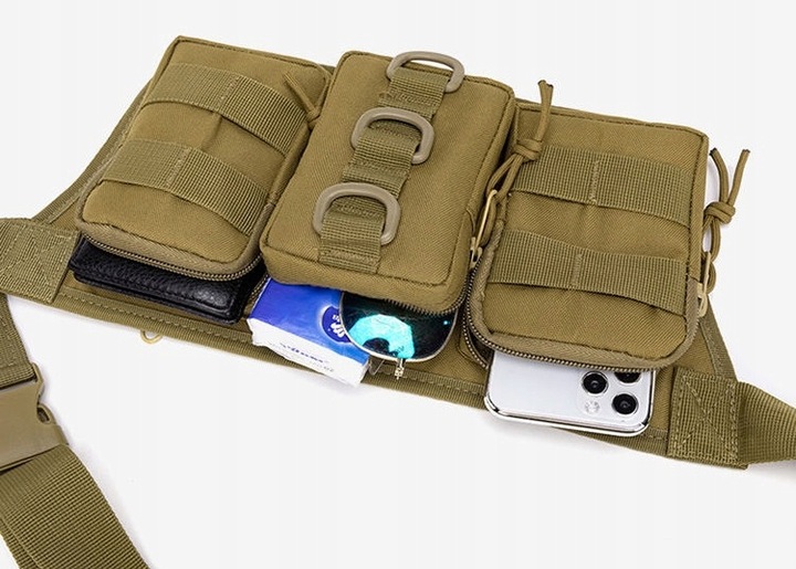 Na przednich kieszeniach naszyte taśmy typy MOLLE. Pojemne przegródki zapinane zamkiem błyskawicznym. Na środku trzy D-ringi do mocowania dodatkowego oporządzenia.