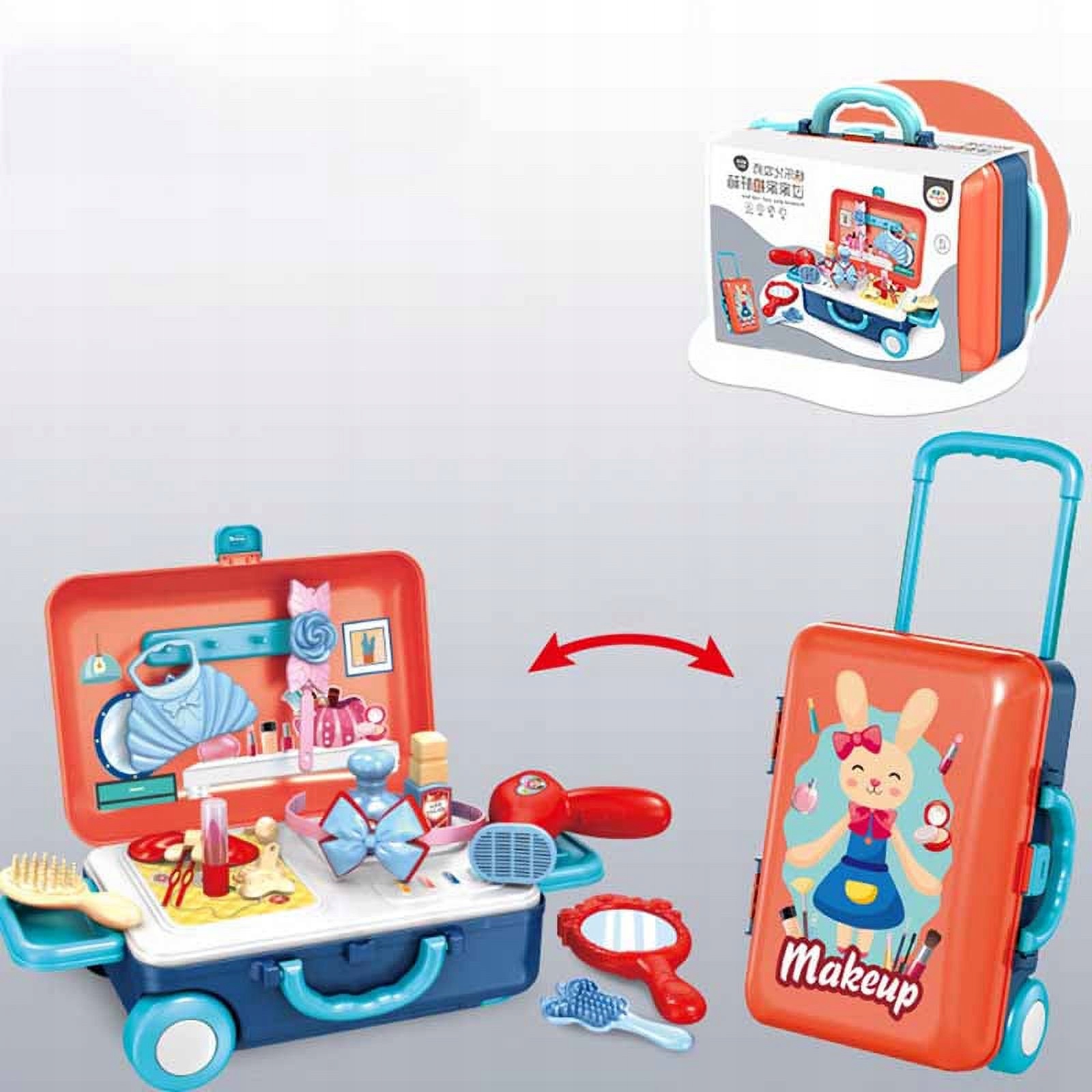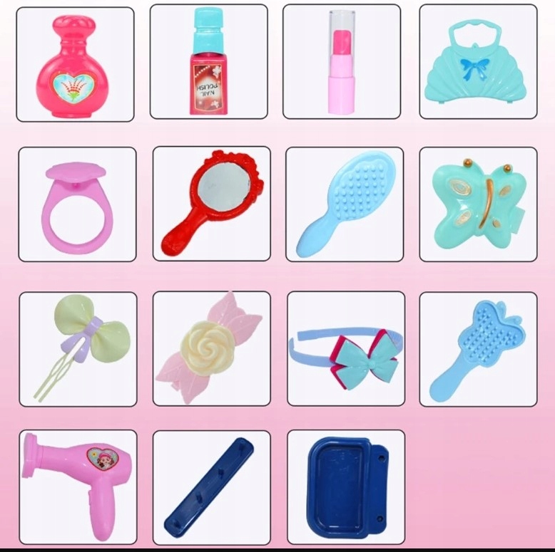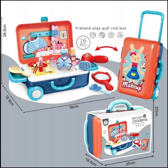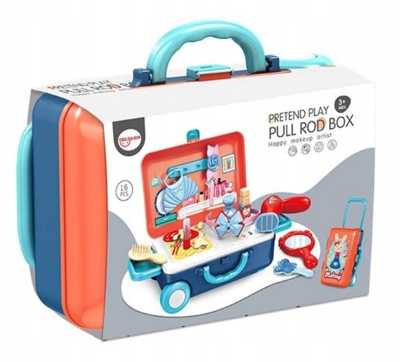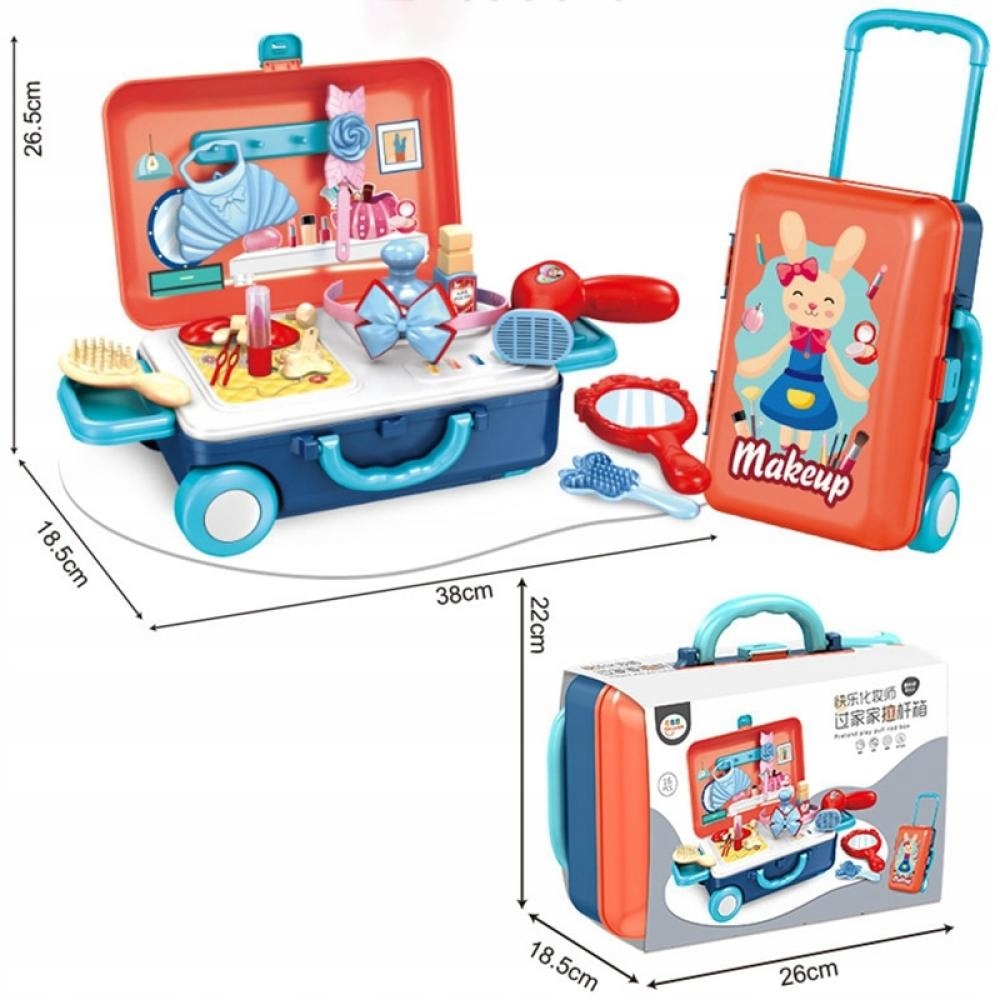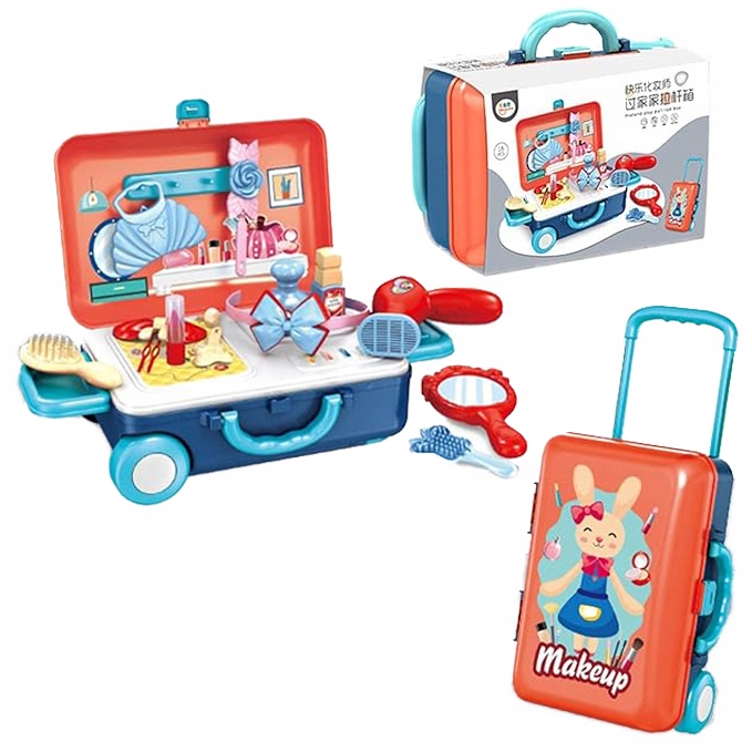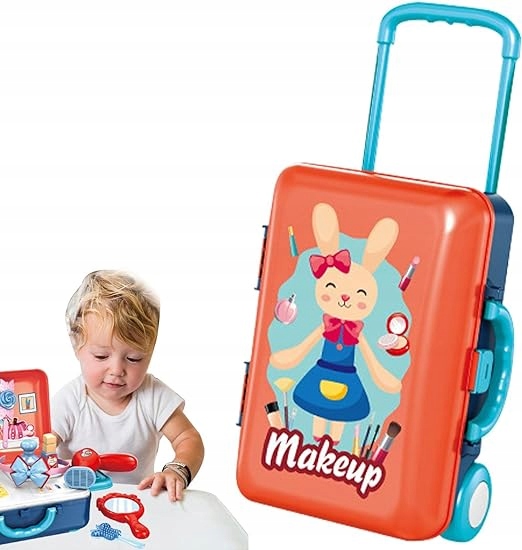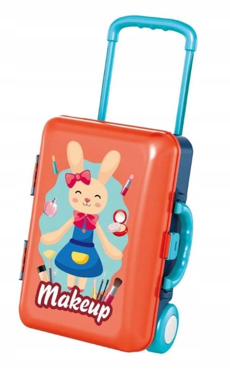 Walizka skrywa w środku niezbędny ekwipunek dla małej wizażystki, kosmetyczki.
